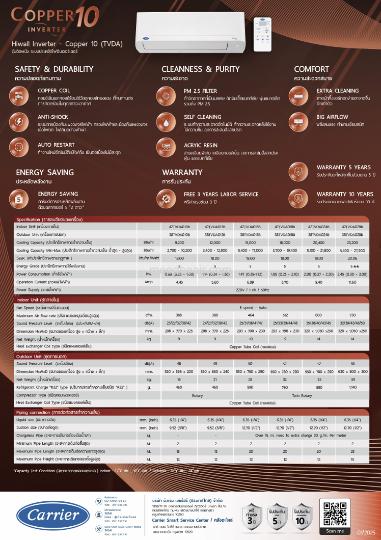 แอร์แคเรียร์ อินเวอร์เตอร์ COPPER 10 รุ่น 42TVDA028A ขนาด 25200 BTU