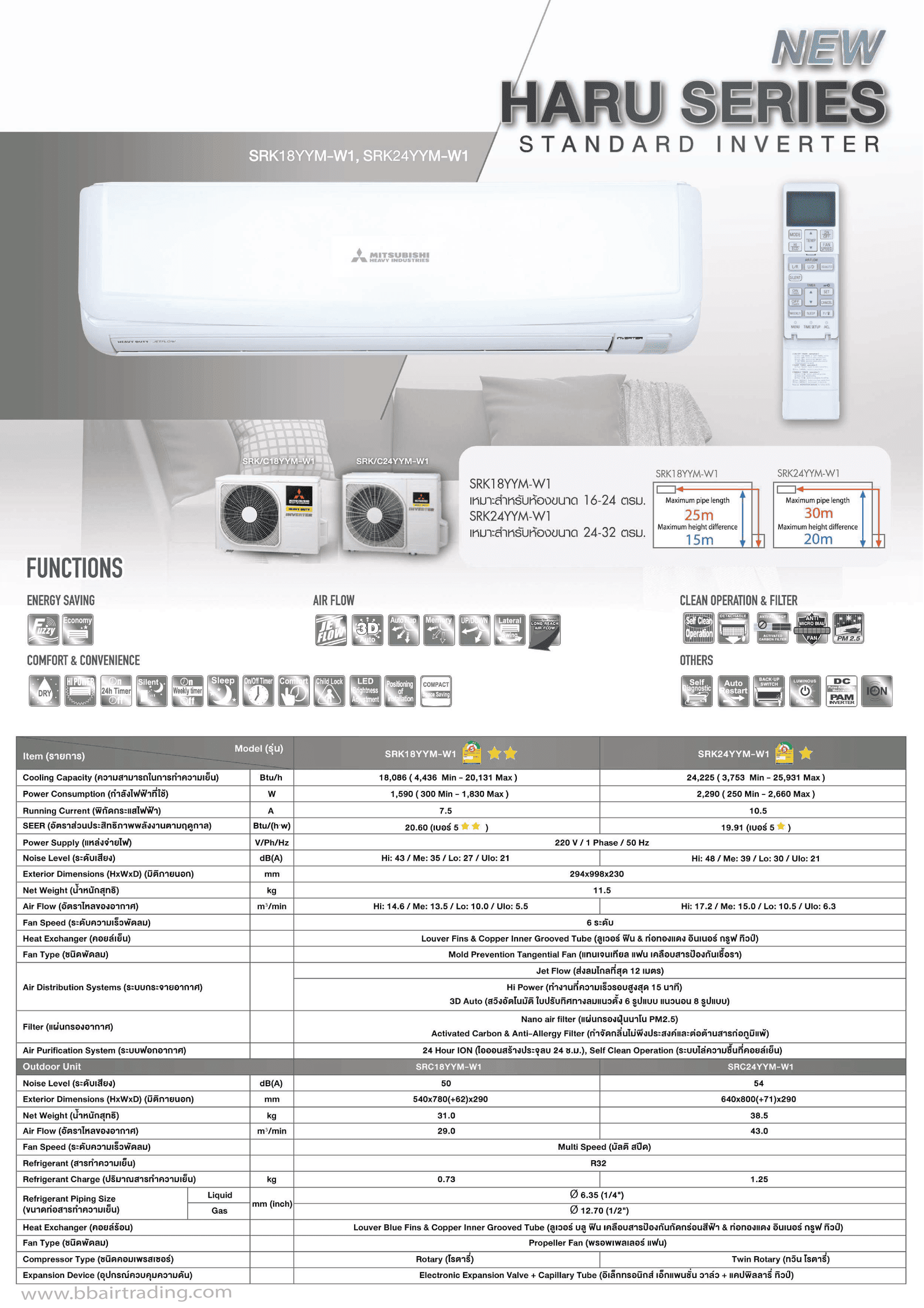 แอร์มิตซูบิชิ เฮฟวี่ อินเวอร์เตอร์ รุ่น SRK18YYS-W1 ขนาด 18244 BTU