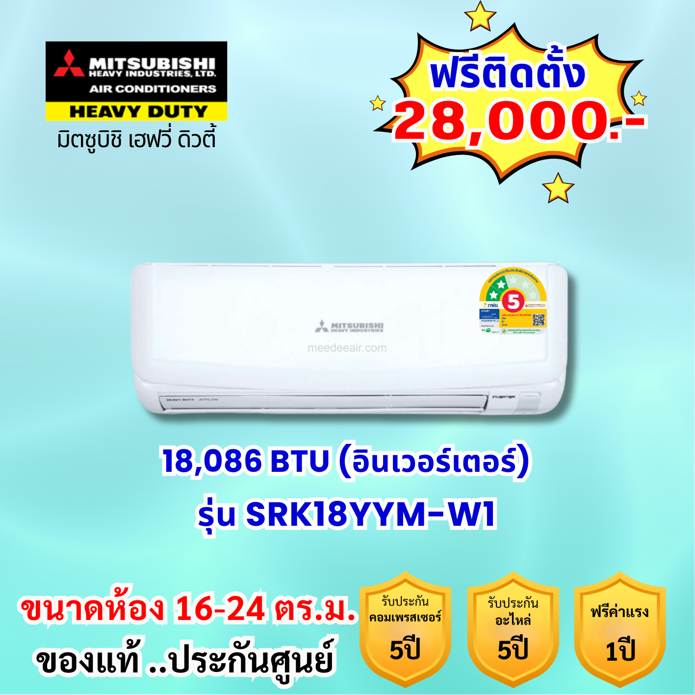 แอร์มิตซูบิชิ เฮฟวี่ อินเวอร์เตอร์ รุ่น SRK18YYM-W1 ขนาด 18086 BTU